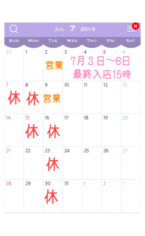 7月前半、ご予約最終受付時間短くなる日がございます。よろしくお願いいたします。
